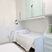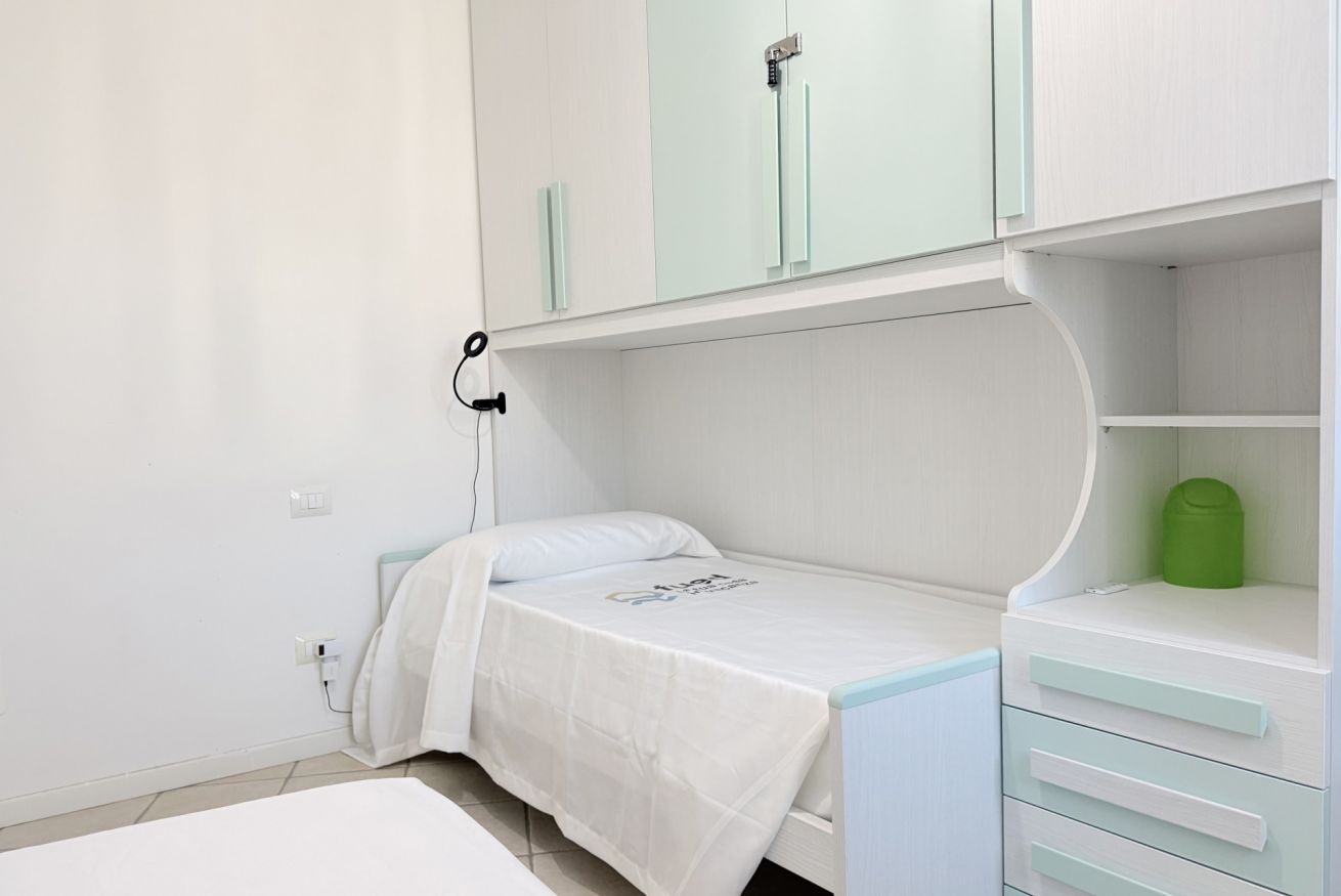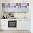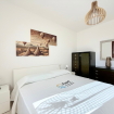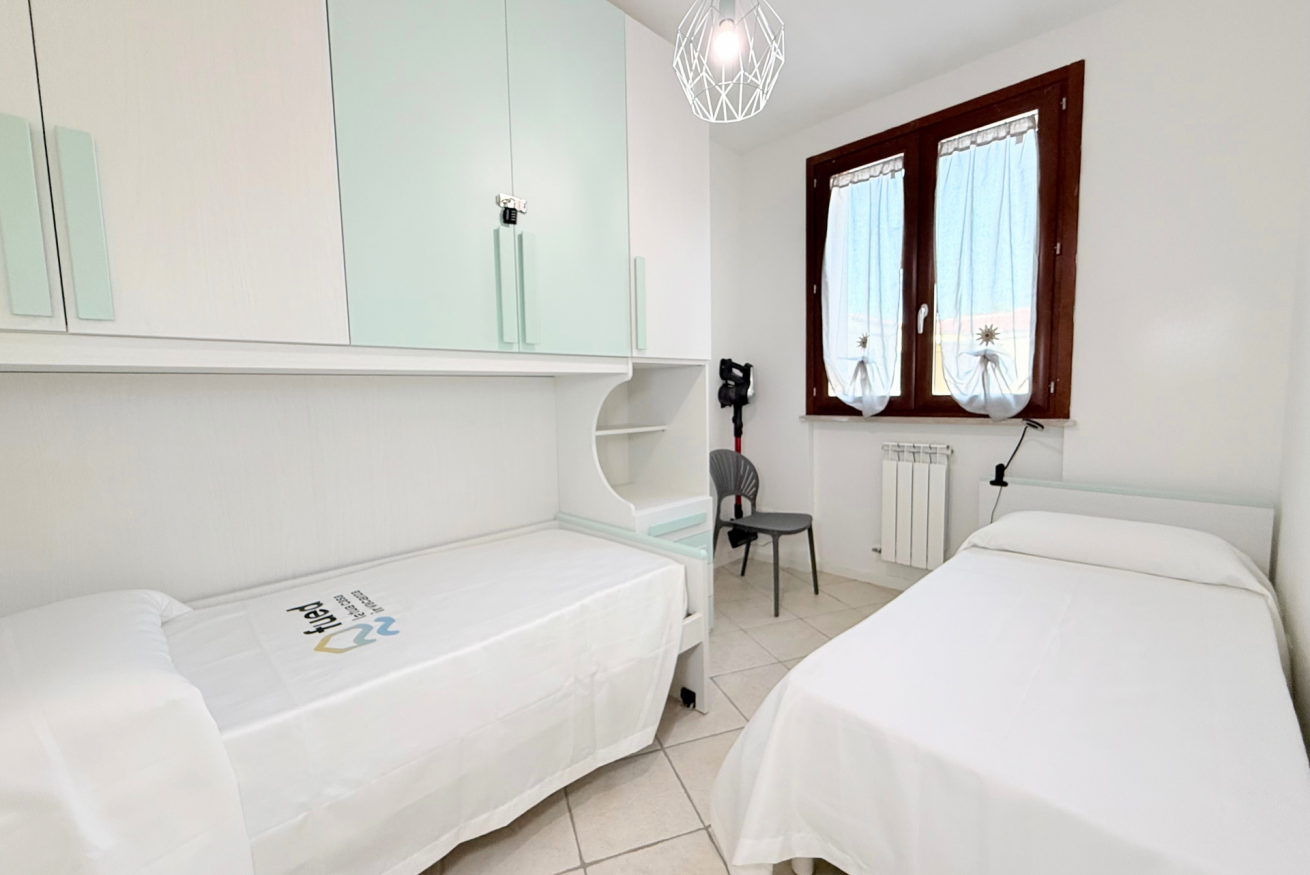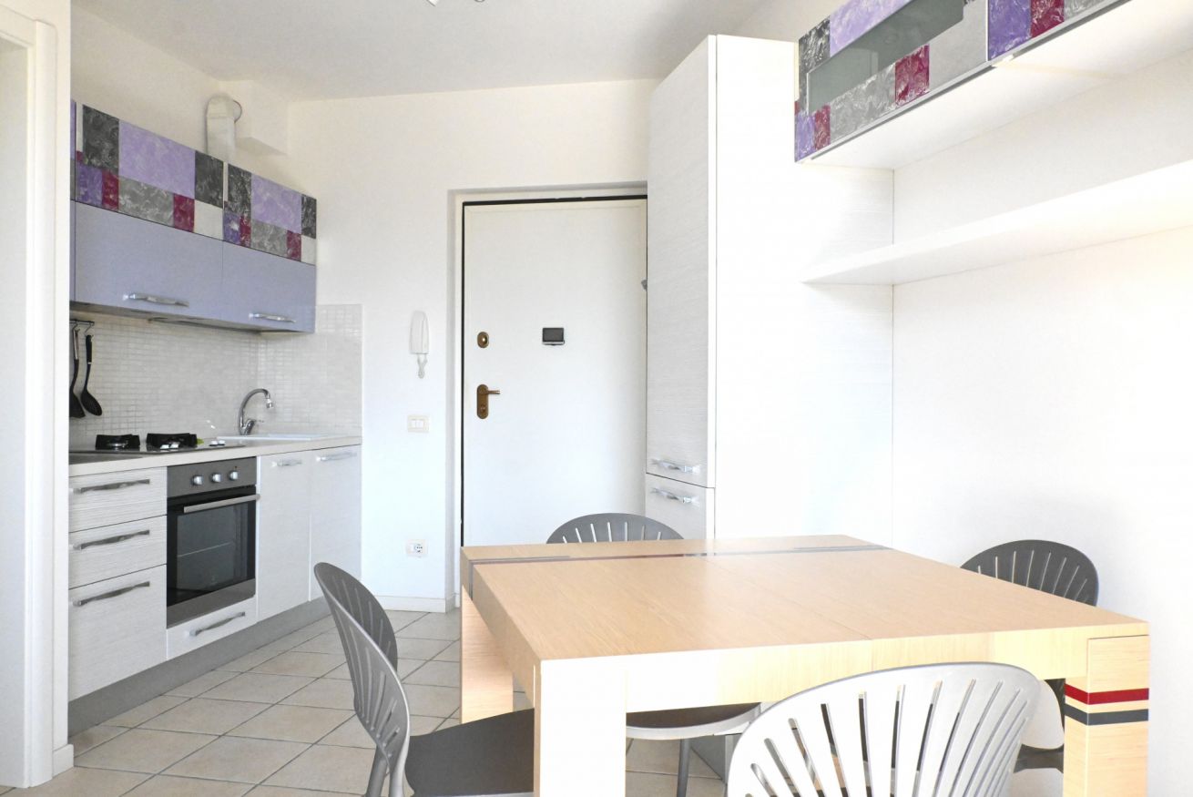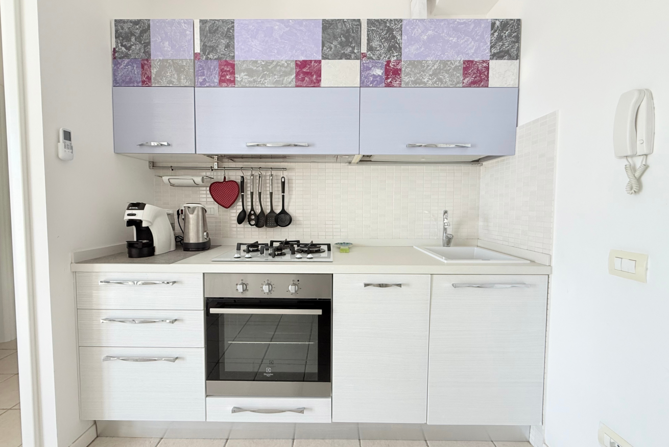 Composto da soggiorno con divano e tavolo da pranzo – terrazzino attrezzato con tavolo e sedie - angolo cottura con lavastoviglie – camera matrimoniale – seconda camera con due letti singoli - bagno con box doccia e lavatrice.