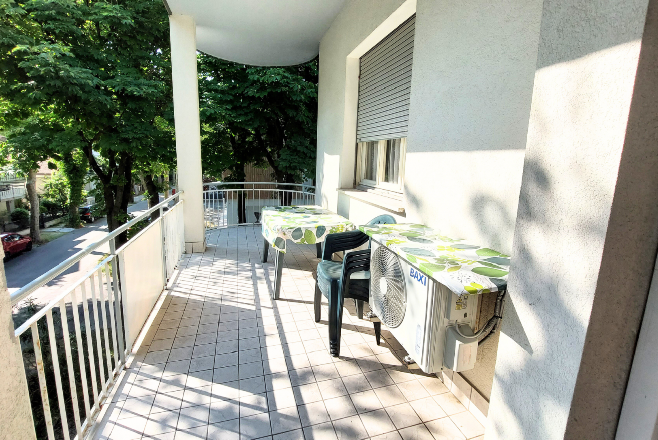 Ingresso su luminoso soggiorno con angolo cottura, tavolo da pranzo e balcone attrezzato con tavolo e sedie dove poter pranzare - camera con letto matrimoniale e letto singolo - seconda camera con letto matrimoniale - bagno completo con doccia.