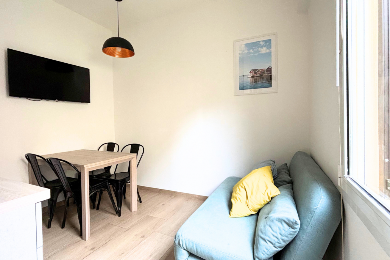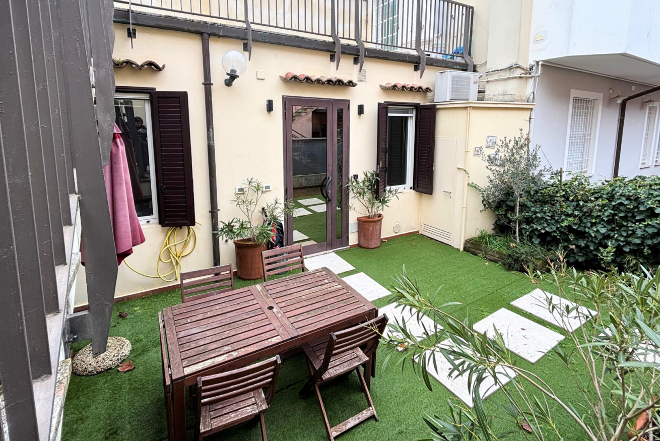 Ingresso in un' accogliente soggiorno con divano letto alla francese, angolo cottura e tavolo da pranzo - camera con letto matrimoniale - bagno completo con doccia - corte pavimentata privata ed attrezzata con tavolo e sedie.