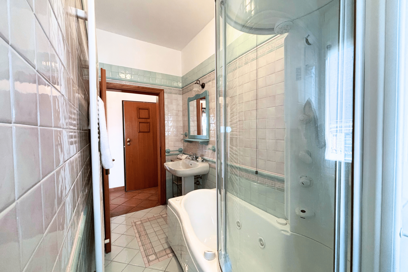 Descrizione: spazioso ed accogliente appartamento al primo piano a 100mt dal mare. Ingresso su grande e luminoso soggiorno con divano, tavolo da pranzo, divano letto matrimoniale e balcone attrezzato - cucina separata con tavolo da pranzo e lavastoviglie - camera con letto matrimoniale e bagno completo en suite - secondo bagno completo con box doccia e vasca. Di fronte all'appartamento: camera matrimoniale indipendente con bagno completo en suite. La casa è dotata di aria condizionata nel corridoio, lavatrice, garage privato, wi-fi, parquet ed un comodo balcone panoramico attrezzato con tavolo e sedie.