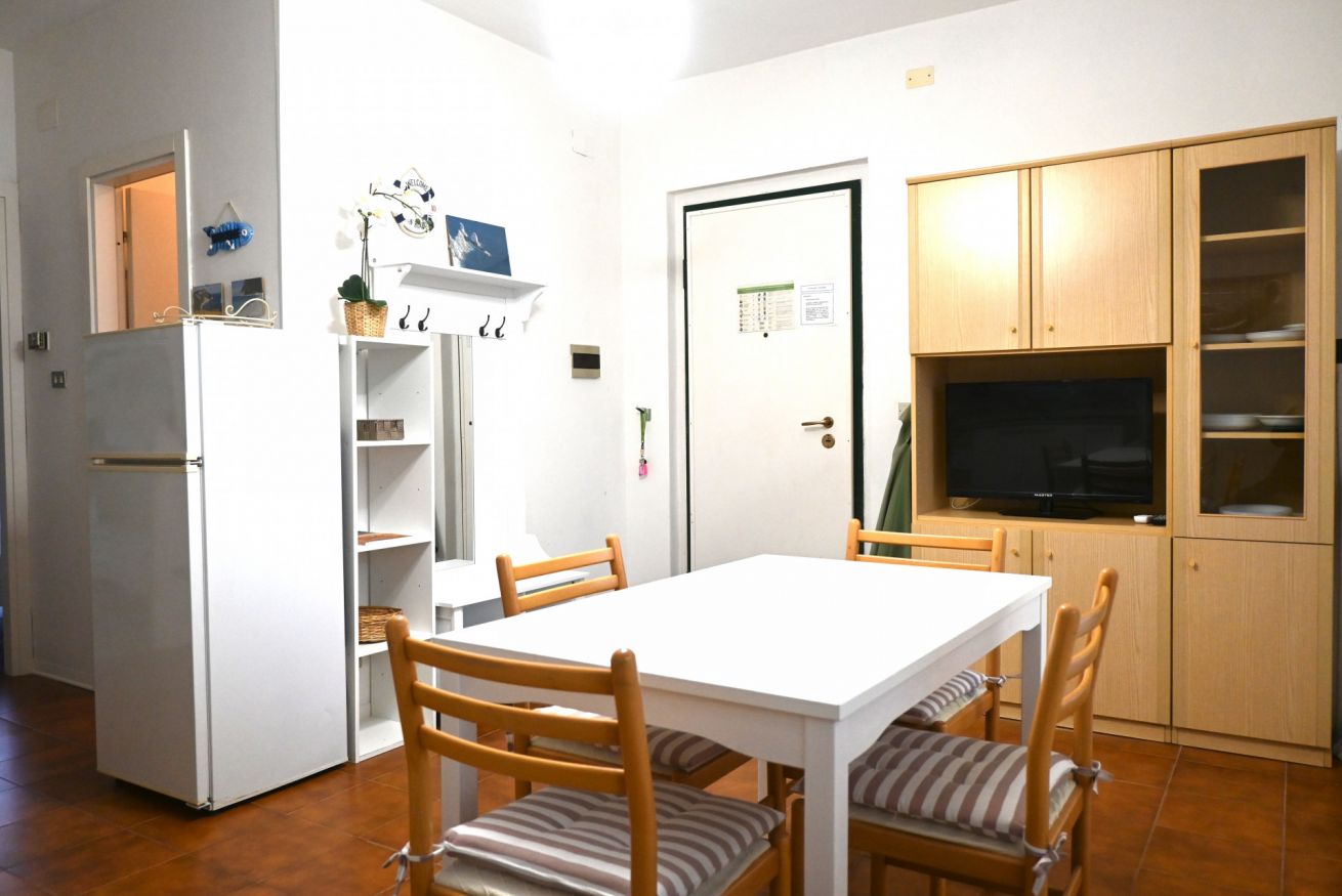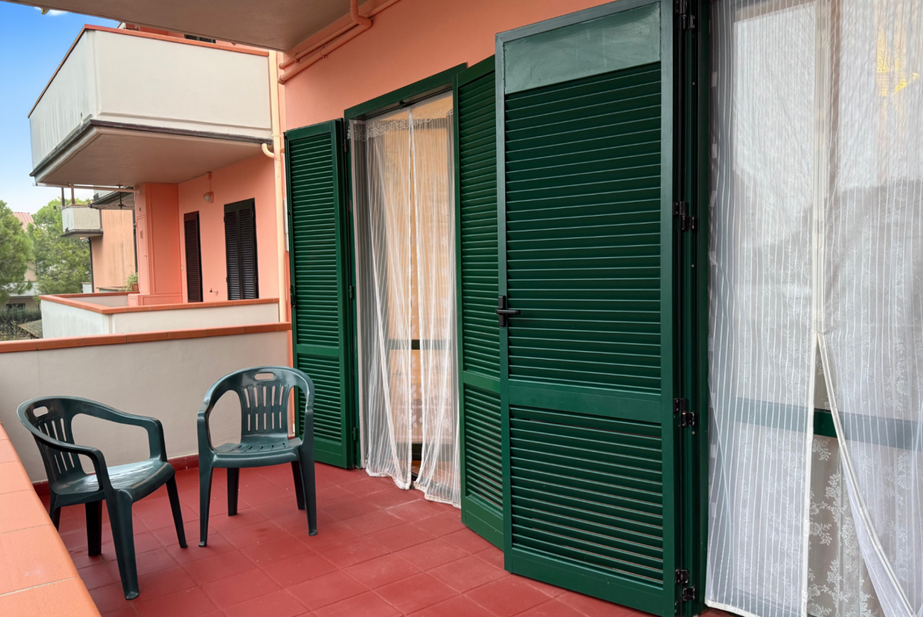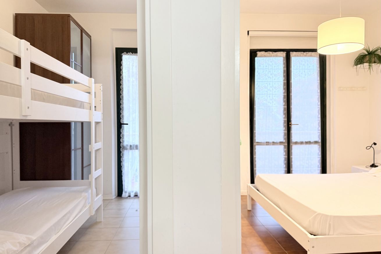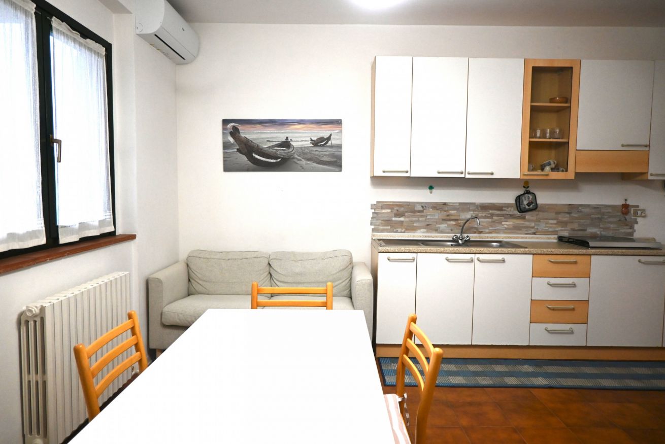 Descrizione: piano primo. Soggiorno con tavolo da pranzo, angolo cottura con forno a microonde, lavatrice e divano – camera matrimoniale con letto matrimoniale e con terrazzo privato – seconda camera con letto a castello – bagno con box doccia – ampio terrazzo sul fronte e sul retro attrezzato con tendone da sole, tavolo, sedie. Posti auto liberi, non riservati e gratuiti nel piazzale sottostante la palazzina. Aria condizionata in zona giorno.