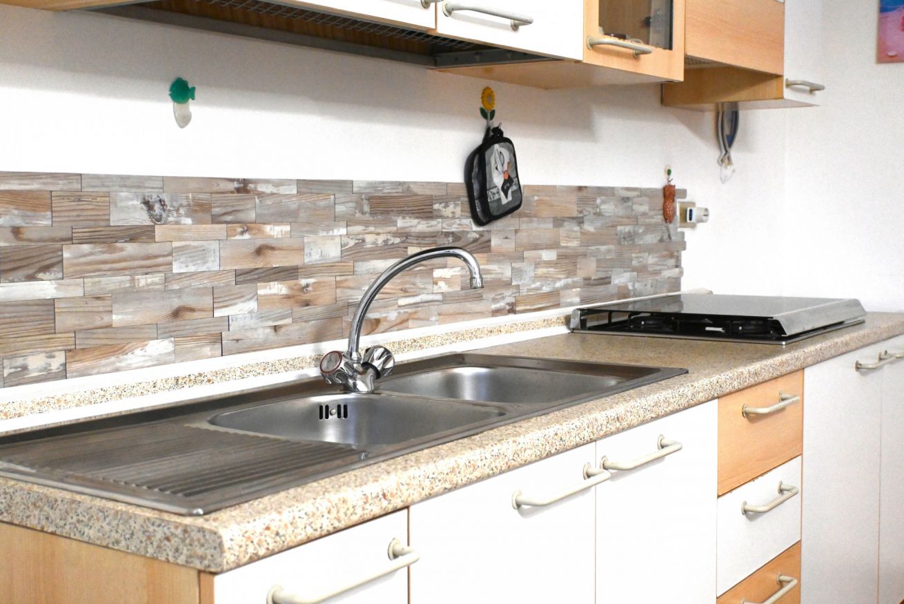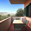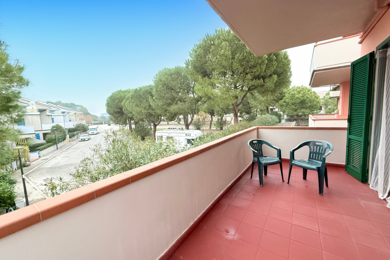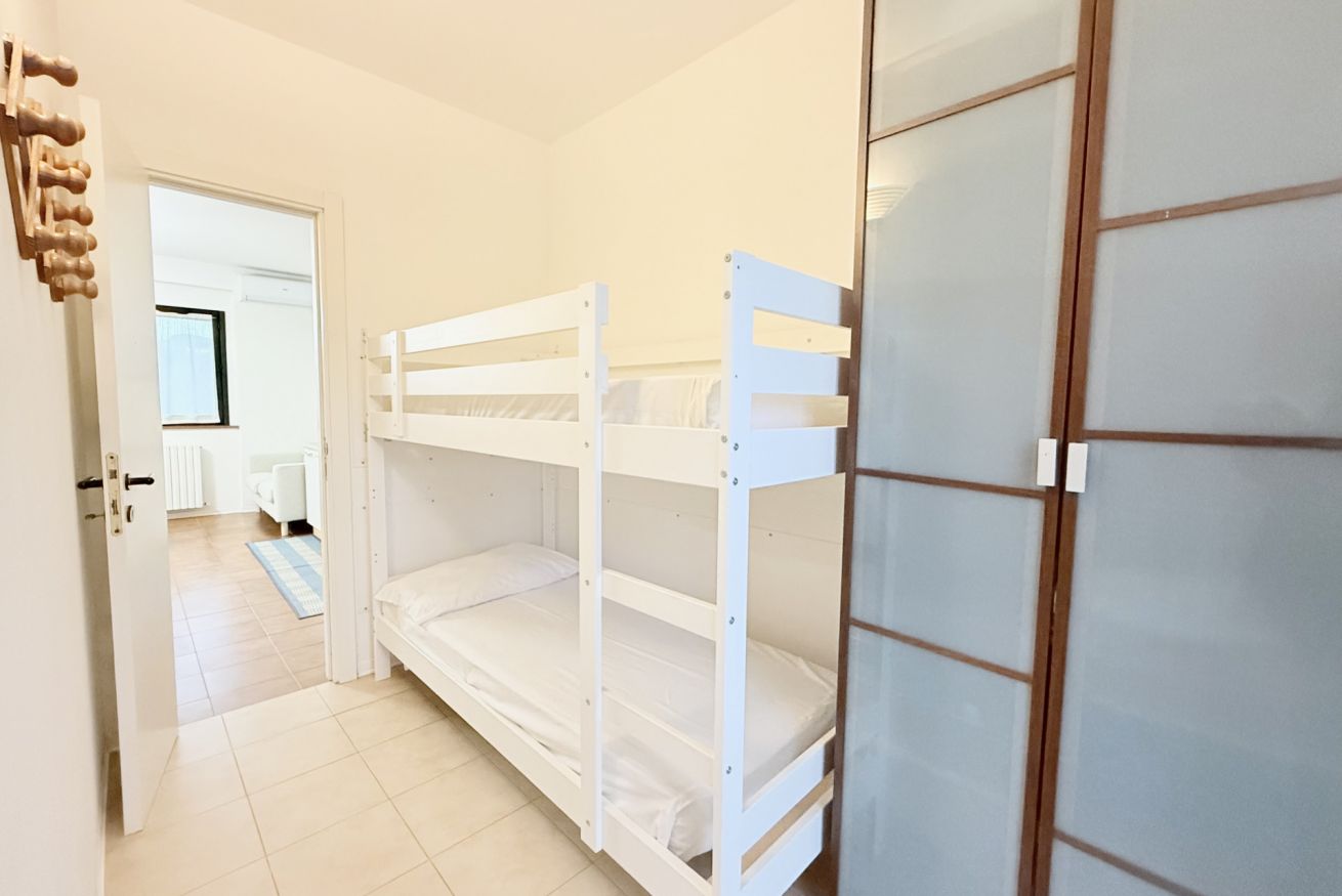 Descrizione: piano primo. Soggiorno con tavolo da pranzo, angolo cottura con forno a microonde, lavatrice e divano – camera matrimoniale con letto matrimoniale e con terrazzo privato – seconda camera con letto a castello – bagno con box doccia – ampio terrazzo sul fronte e sul retro attrezzato con tendone da sole, tavolo, sedie. Posti auto liberi, non riservati e gratuiti nel piazzale sottostante la palazzina. Aria condizionata in zona giorno.