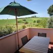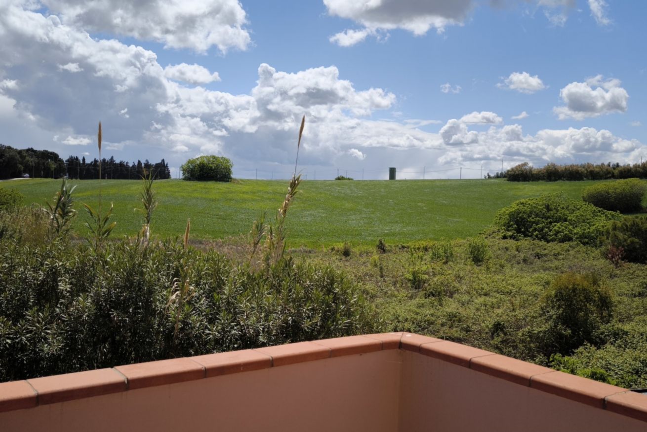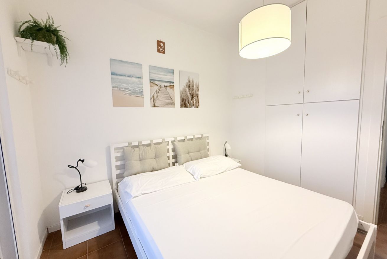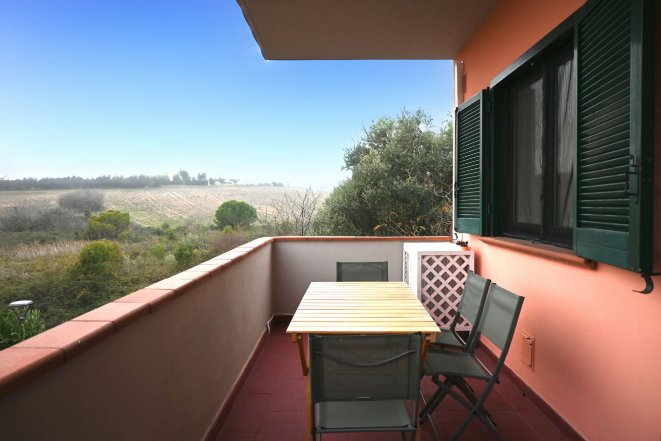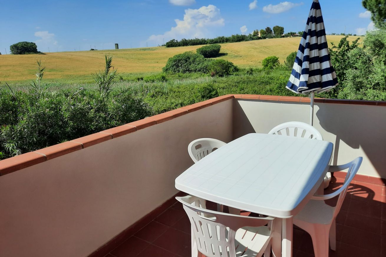 Descrizione: piano primo. Soggiorno con tavolo da pranzo, angolo cottura con forno a microonde, lavatrice e divano – camera matrimoniale con letto matrimoniale e con terrazzo privato – seconda camera con letto a castello – bagno con box doccia – ampio terrazzo sul fronte e sul retro attrezzato con tendone da sole, tavolo, sedie. Posti auto liberi, non riservati e gratuiti nel piazzale sottostante la palazzina. Aria condizionata in zona giorno.