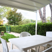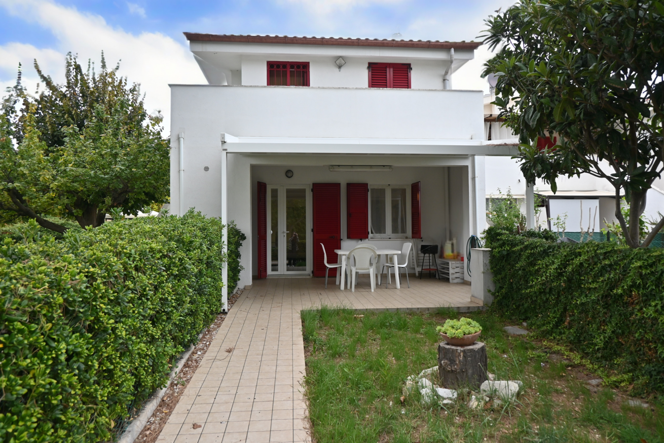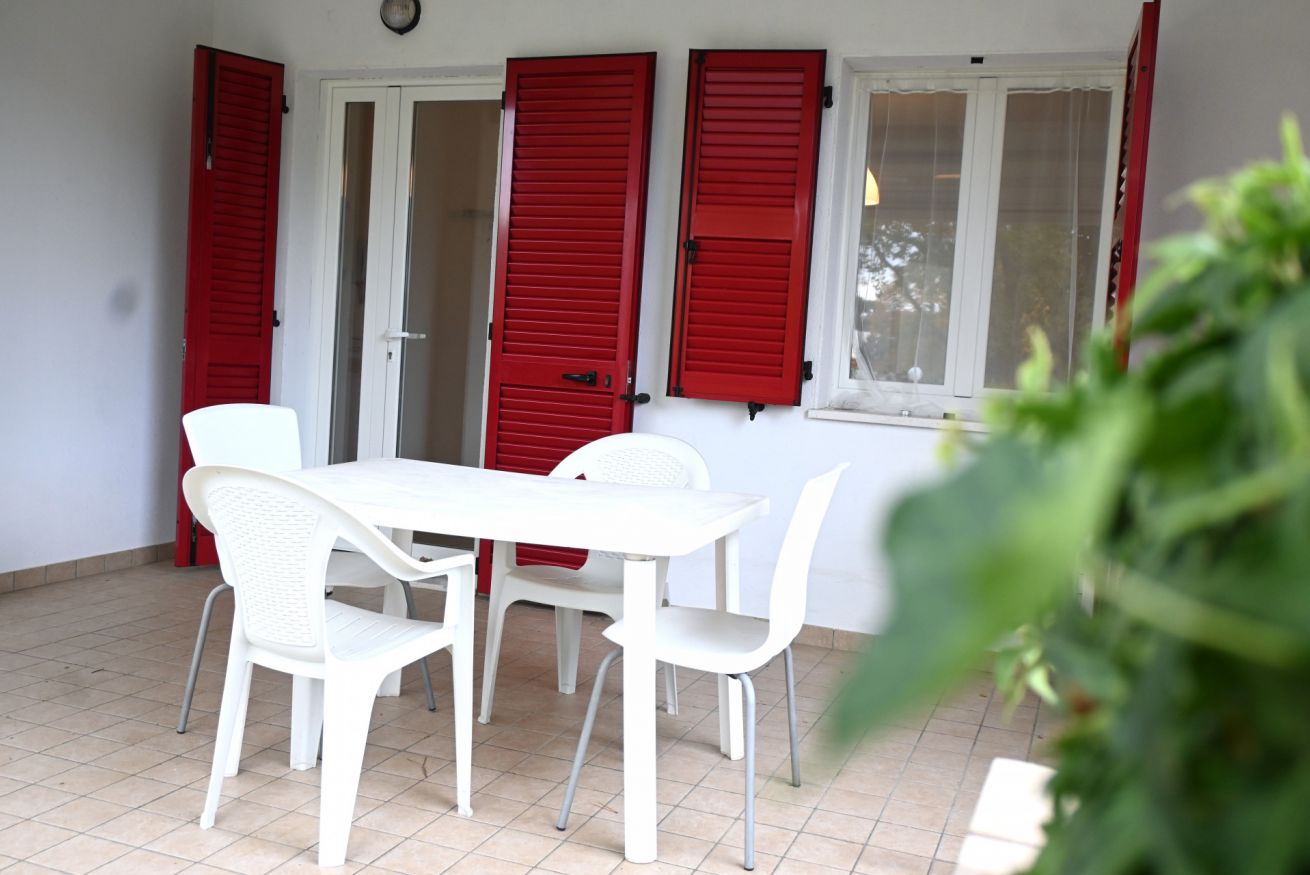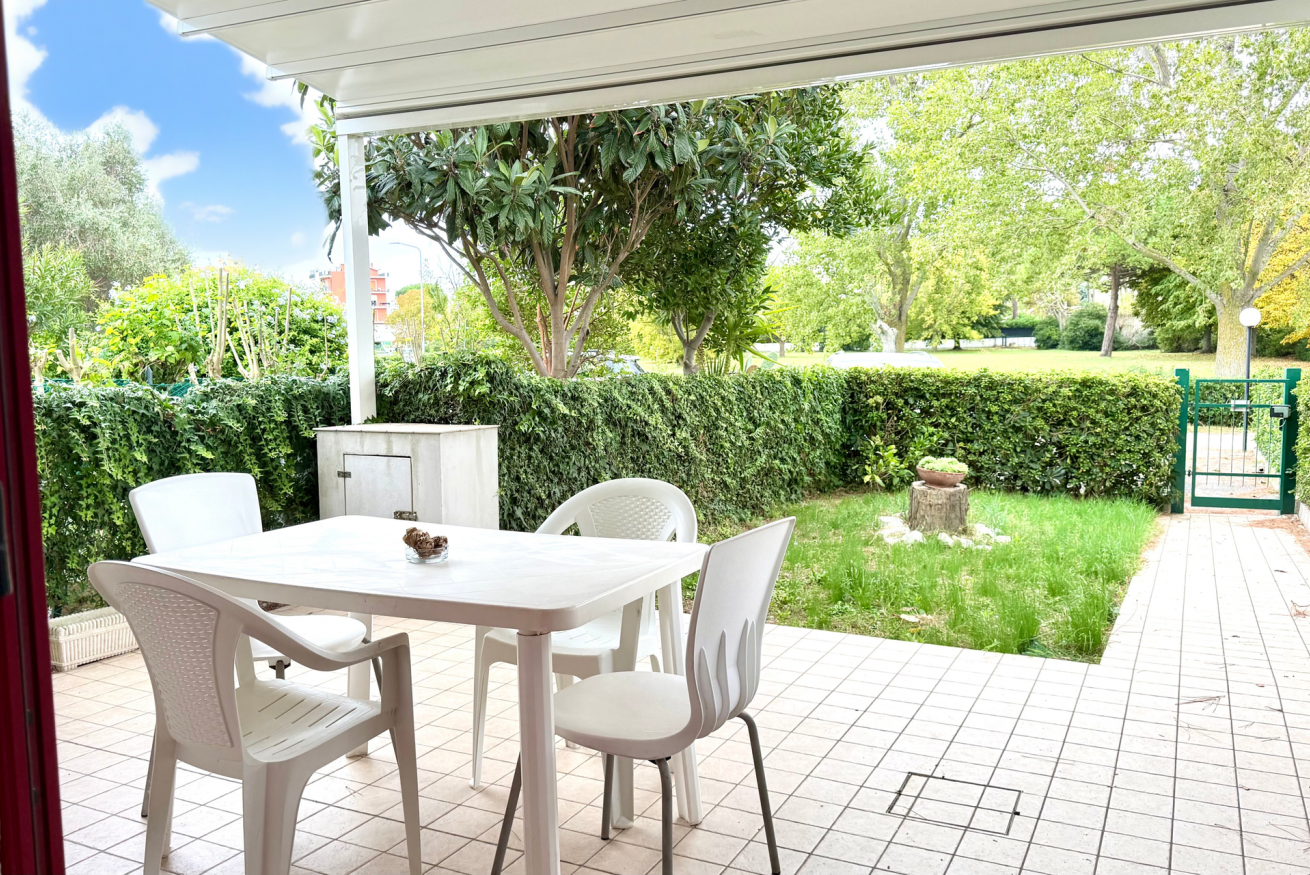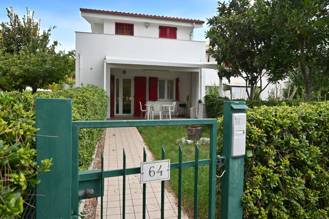 L'appartamento, posto al piano terra, dispone di ingresso dal giardino frontale, con portico attrezzato con tavolo e sedie per pranzare all'aperto. All'interno si trovano un soggiorno con tavolo da pranzo, divano letto doppio e angolo cottura; una camera matrimoniale; una seconda camera con letto a castello; un bagno con box doccia e lavatrice; un secondo bagno con doccia. Completa la proprietà un ulteriore giardino sul retro, accessibile direttamente dalla camera.