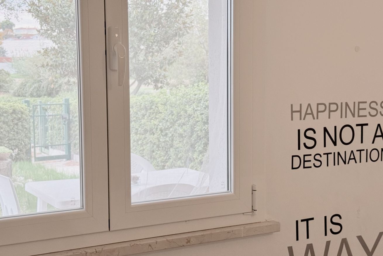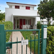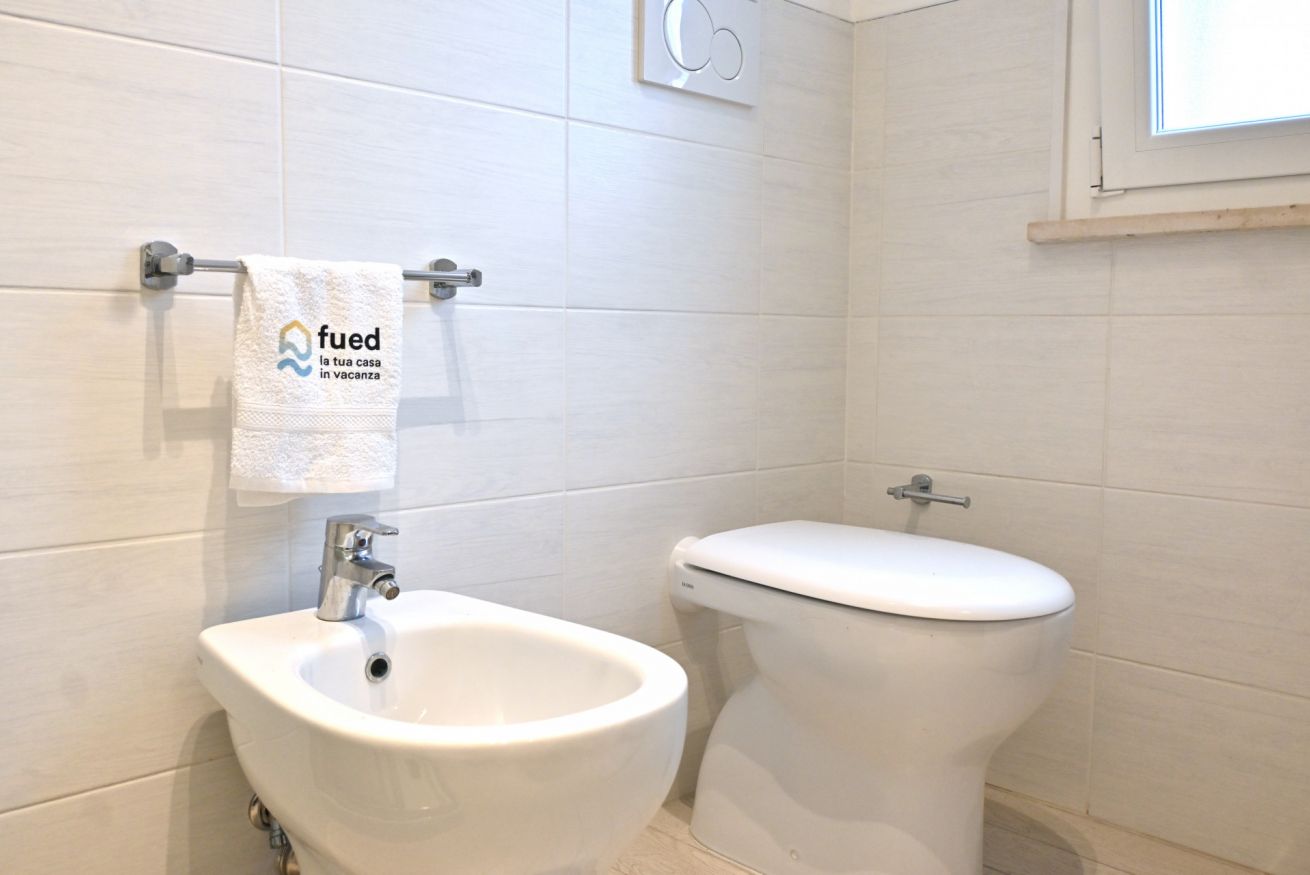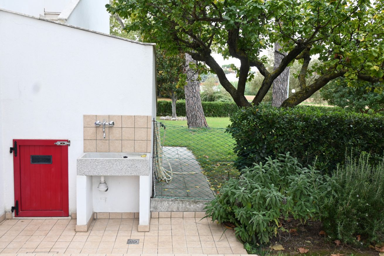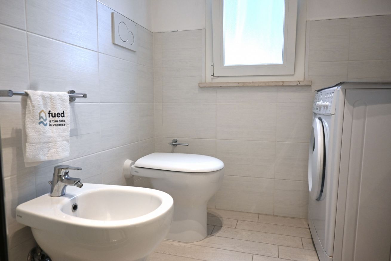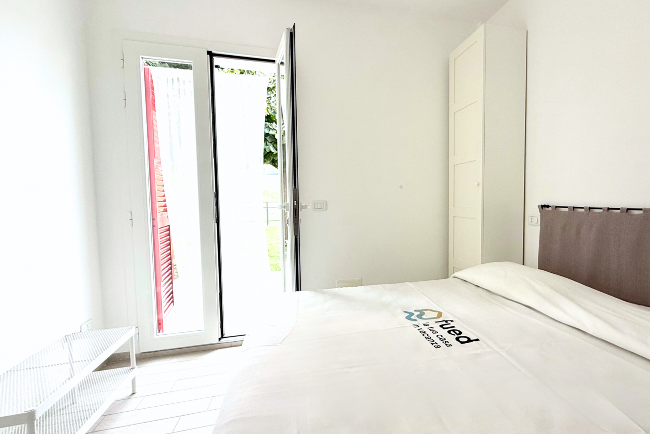 L'appartamento, posto al piano terra, dispone di ingresso dal giardino frontale, con portico attrezzato con tavolo e sedie per pranzare all'aperto. All'interno si trovano un soggiorno con tavolo da pranzo, divano letto doppio e angolo cottura; una camera matrimoniale; una seconda camera con letto a castello; un bagno con box doccia e lavatrice; un secondo bagno con doccia. Completa la proprietà un ulteriore giardino sul retro, accessibile direttamente dalla camera.