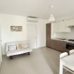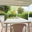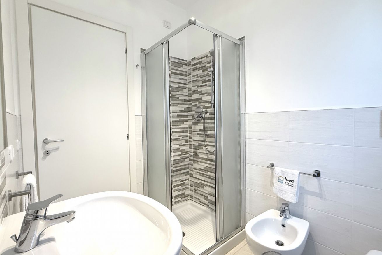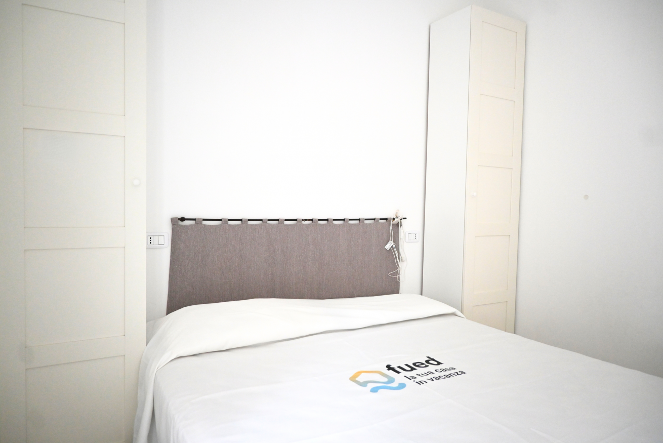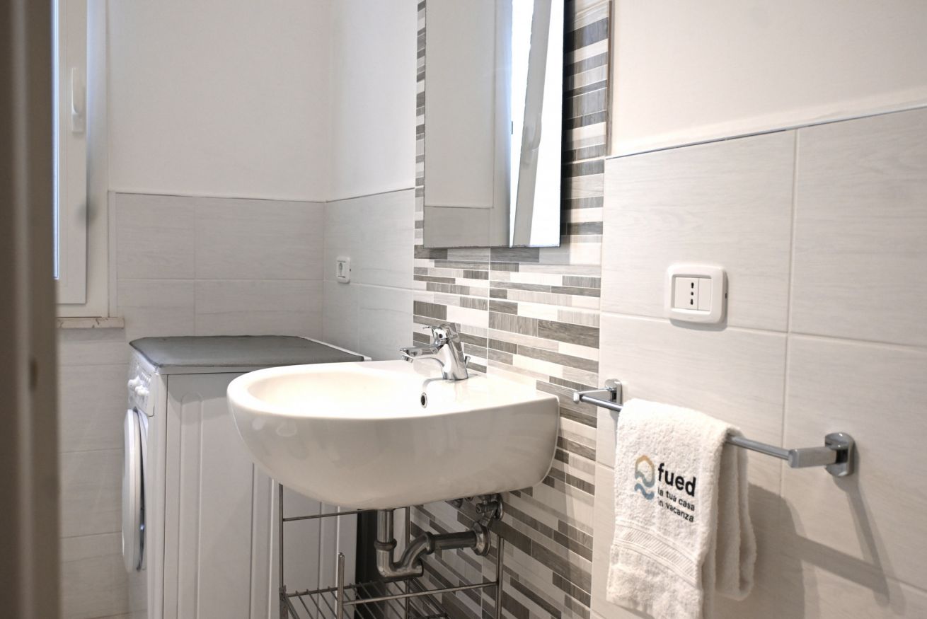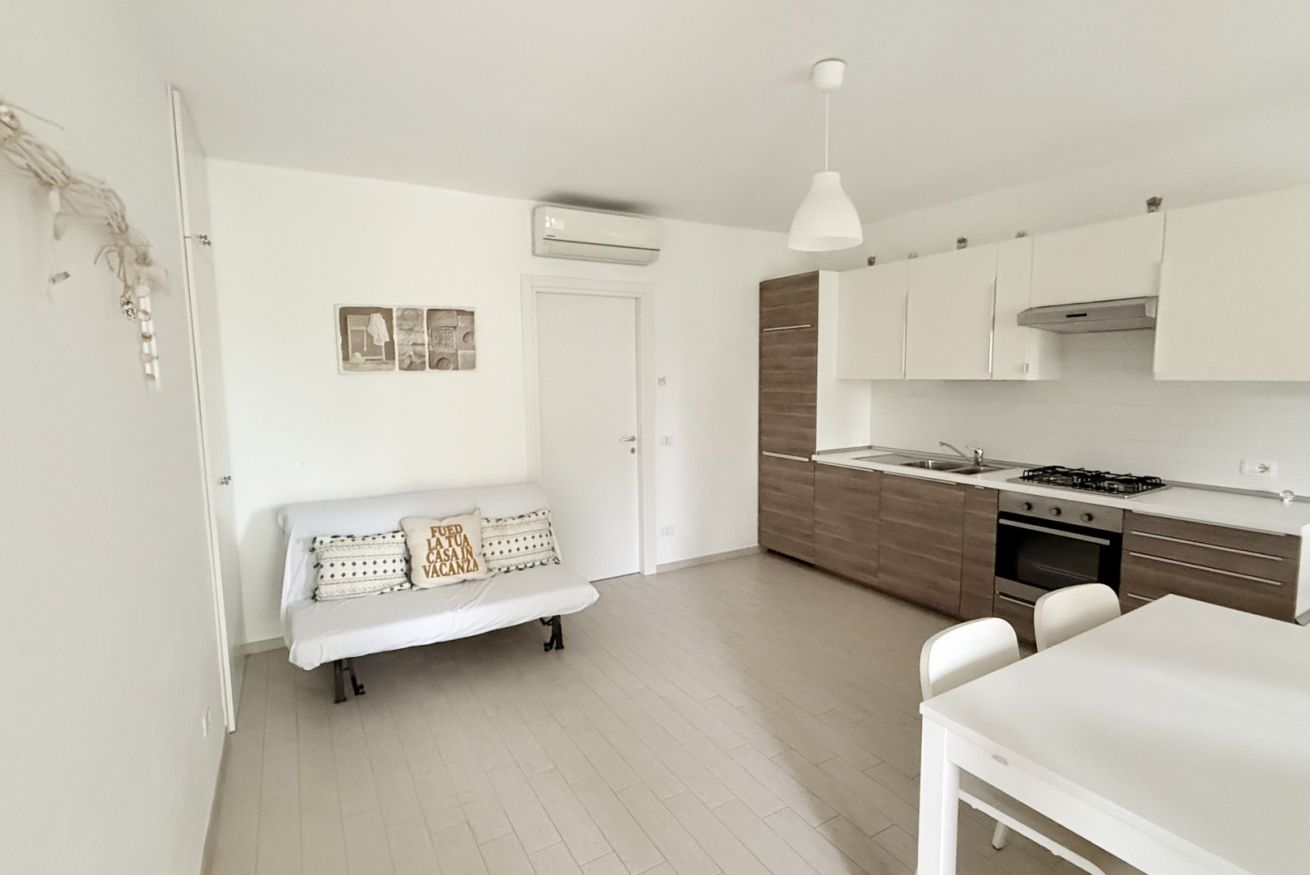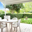 L'appartamento, posto al piano terra, dispone di ingresso dal giardino frontale, con portico attrezzato con tavolo e sedie per pranzare all'aperto. All'interno si trovano un soggiorno con tavolo da pranzo, divano letto doppio e angolo cottura; una camera matrimoniale; una seconda camera con letto a castello; un bagno con box doccia e lavatrice; un secondo bagno con doccia. Completa la proprietà un ulteriore giardino sul retro, accessibile direttamente dalla camera.