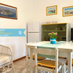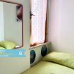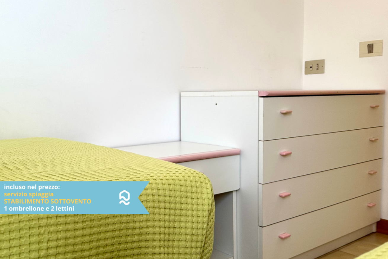 Descrizione: appartamento trilocale al primo piano. Ingresso, zona giorno con tavolo e divanetto, angolo cottura ed accesso al terrazzo attrezzato – camera matrimoniale – cameretta con due letti singoli – bagno con doccia e lavatrice.