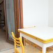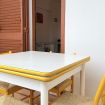 Piano terra: soggiorno con tavolo da pranzo, divano ed angolo cottura.