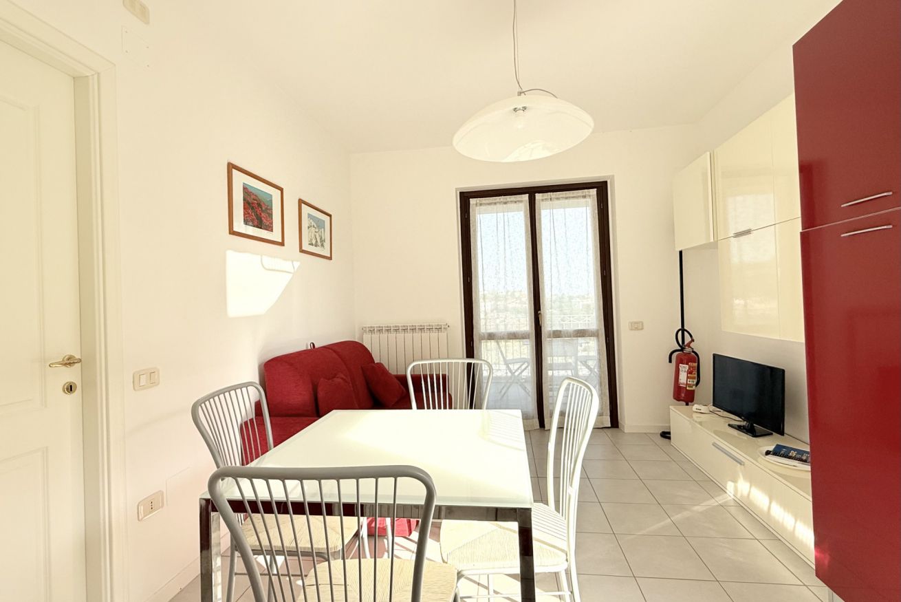 Descrizione: completamente nuovo. Primo ed ultimo piano di palazzina. Soggiorno con angolo cottura e lavatrice, tavolo da pranzo e divano-letto alla francese – camera con letto matrimoniale – bagno con box doccia – delizioso terrazzo panoramico coperto attrezzato con tavolo e sedie dove poter mangiare. Aria condizionata. Posto auto di fronte all’immobile.