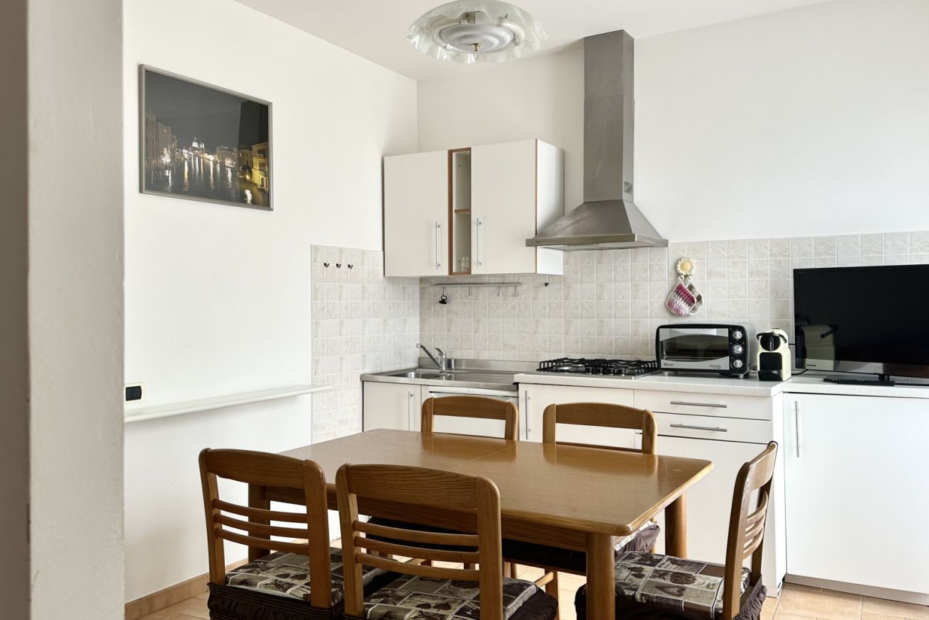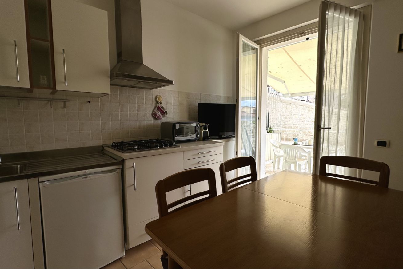 Descrizione: piano rialzato. Soggiorno con angolo cottura, tavolo da pranzo e divano-letto matrimoniale – camera padronale con letto matrimoniale – bagno con box doccia e lavatrice – terrazzo attrezzato con tavolo e sedie.