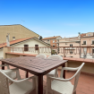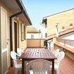 Spazioso terrazzo attrezzato con tavolo in legno e sedie dove poter mangiare.