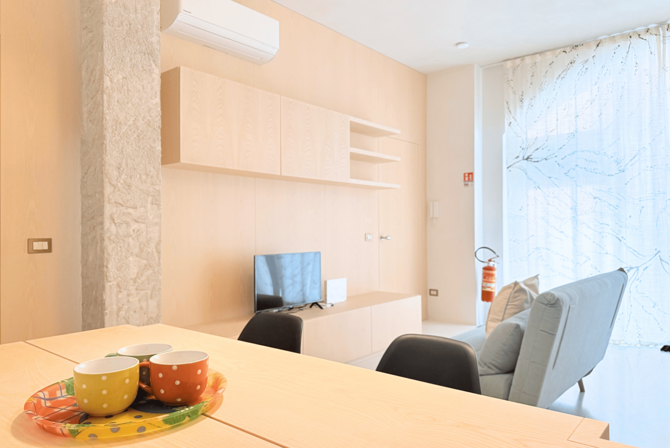 Descrizione: nuovo appartamento super accessoriato con ingresso indipendente. Ingresso su luminoso soggiorno con divano letto matrimoniale, tavolo da pranzo ed angolo cottura con lavastoviglie– ampia camera con letto matrimoniale king size – bagno completo con box doccia e lavatrice. La casa è dotata di aria condizionata in ogni stanza, wi-fi, macchina del caffè, moderni arredi e posizione unica.