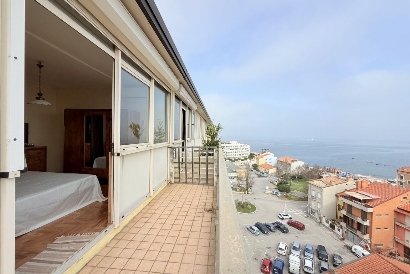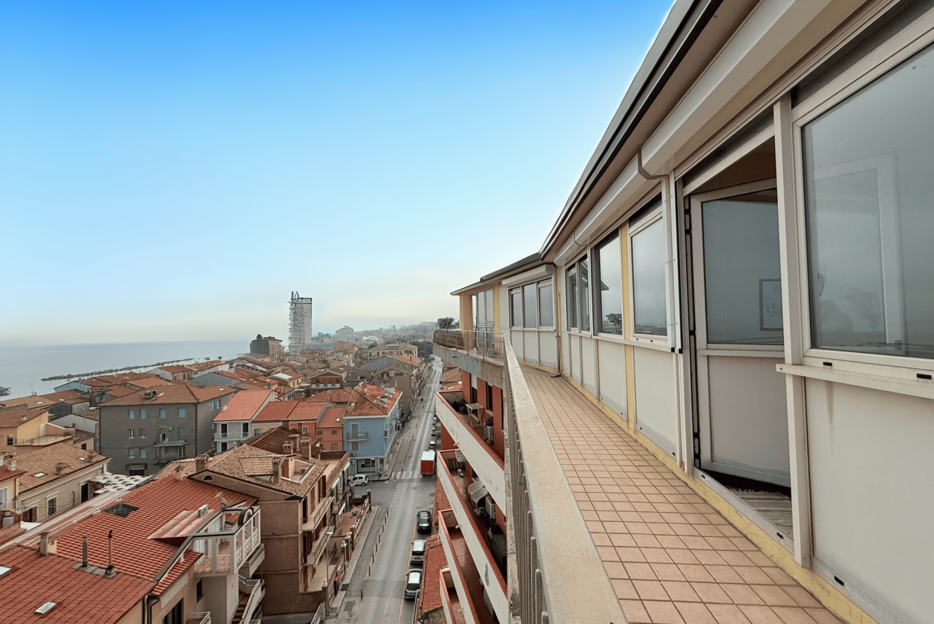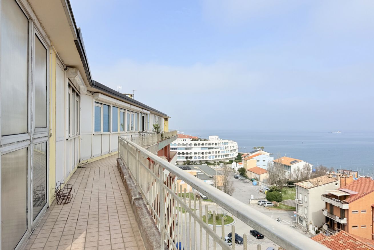 Descrizione: luminoso e spazioso attico al settimo ed ultimo piano con ascensore (arriva fino al sesto piano). L'appartamento è caratterizzato da ampi spazi interni, aria condizionata in ogni stanza e da un incantevole terrazza con un'esclusiva vista panoramica sul mare e sul litorale marchigiano.