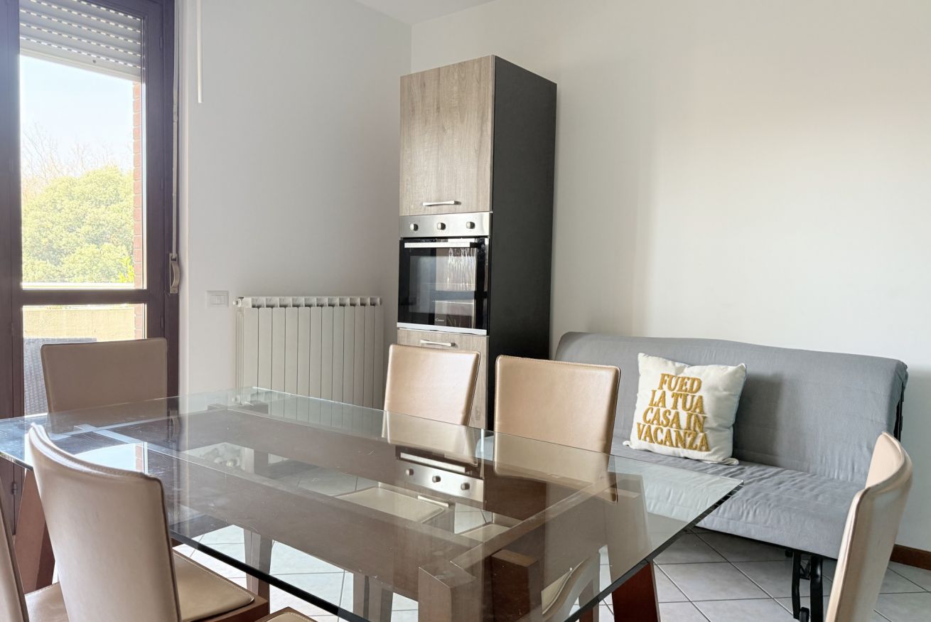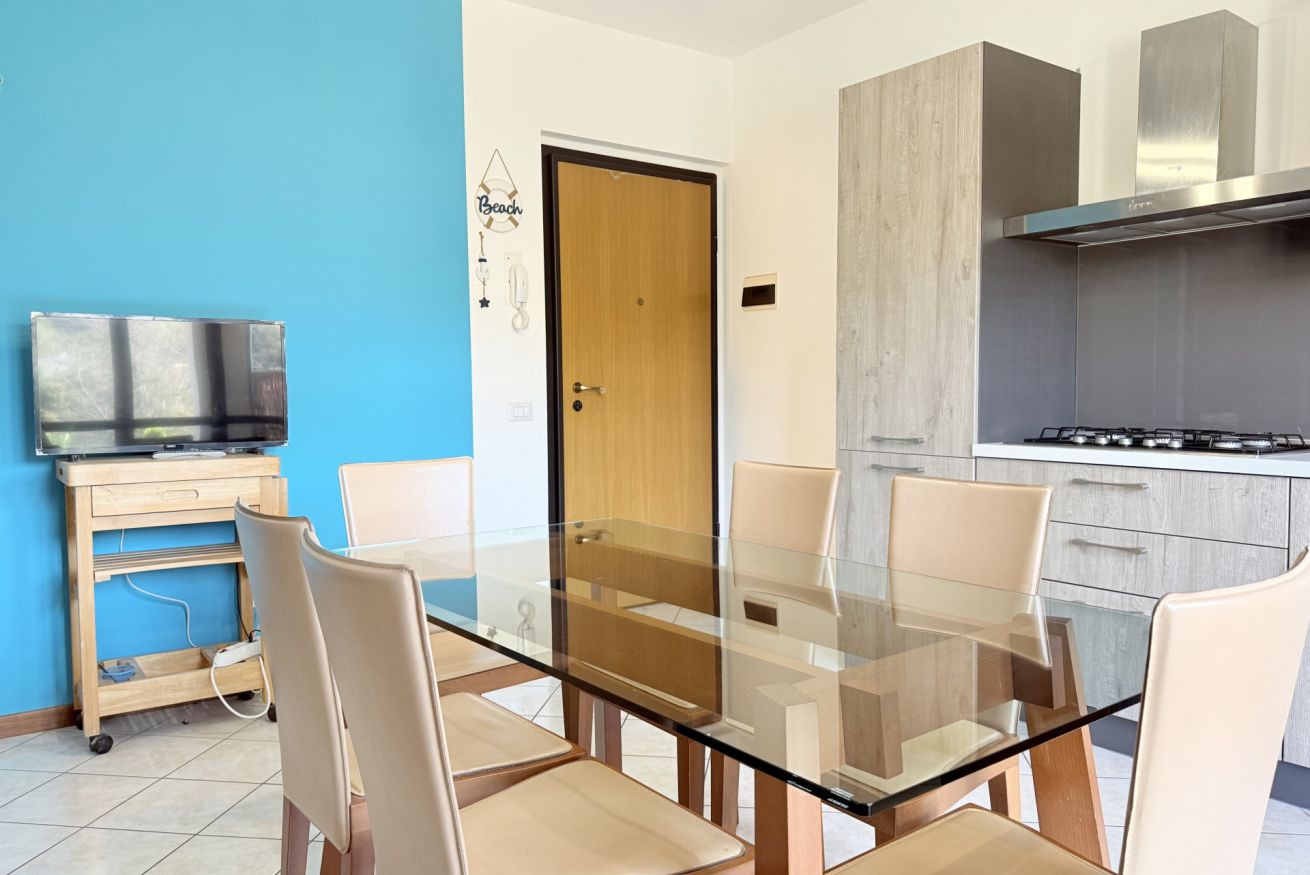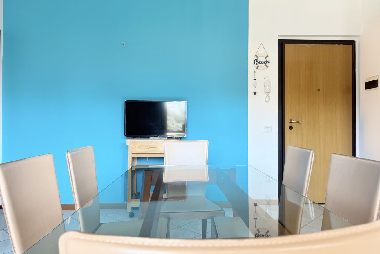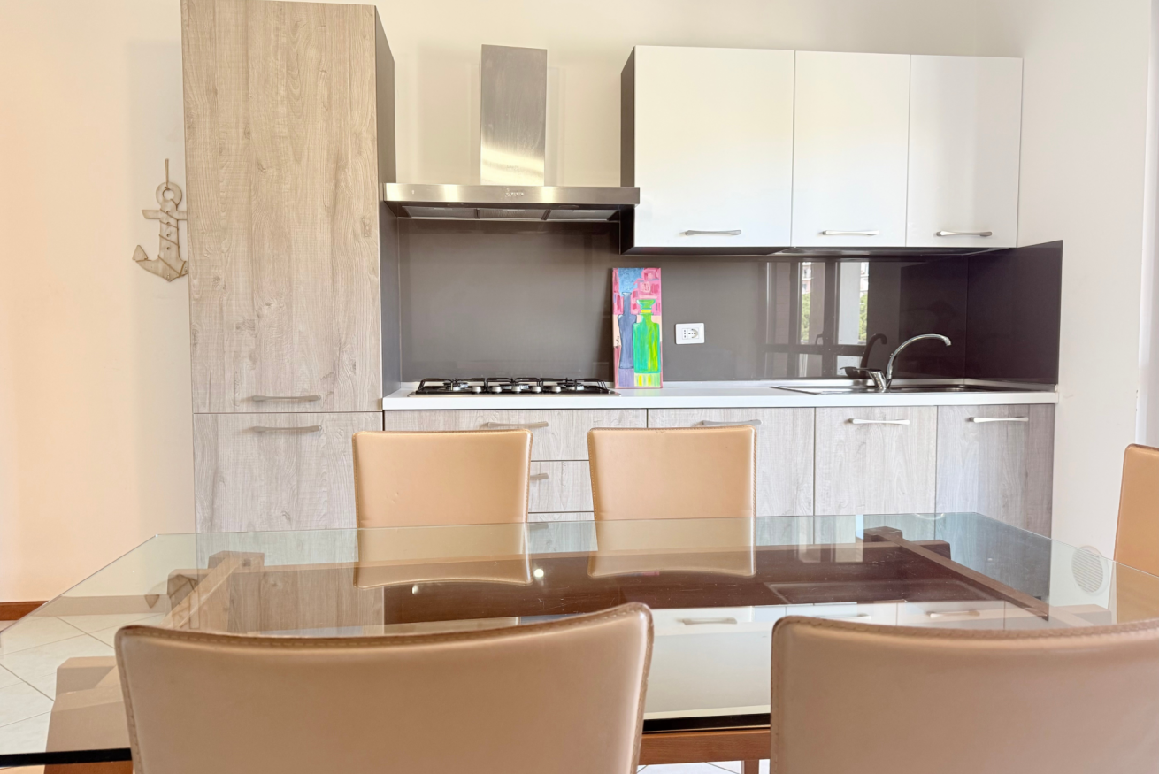 Descrizione: accogliente trilocale con nuovi arredi interni al secondo piano con ascensore. Ingresso su luminoso soggiorno con tavolo da pranzo, divano letto matrimoniale, tv ed angolo cottura con lavastoviglie - comodo ed ampio balcone coperto, attrezzato con divanetti, tavolo, sedie e lavatrice - camera con letto matrimoniale e letto singolo - seconda camera con due letti singoli - bagno completo con box doccia.
