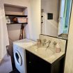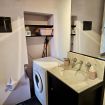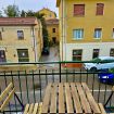 Description: First floor. Living room with kitchen corner (with dishwasher) dining table and sofa - double bedroom - second bedroom with French bed - bathroom with shower and washing machine - balcony with table and chairs. Air conditioning in every room.