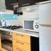 Description: welcoming three-room apartment on the ground floor with a large fenced courtyard equipped with table and chairs. Entrance onto bright living room with sofa and dining table - new kitchen equipped with dishwasher - bedroom with double bed - second bedroom with bunk bed - complete bathroom with tub with shower and washing machine. Ceiling blades in every room.