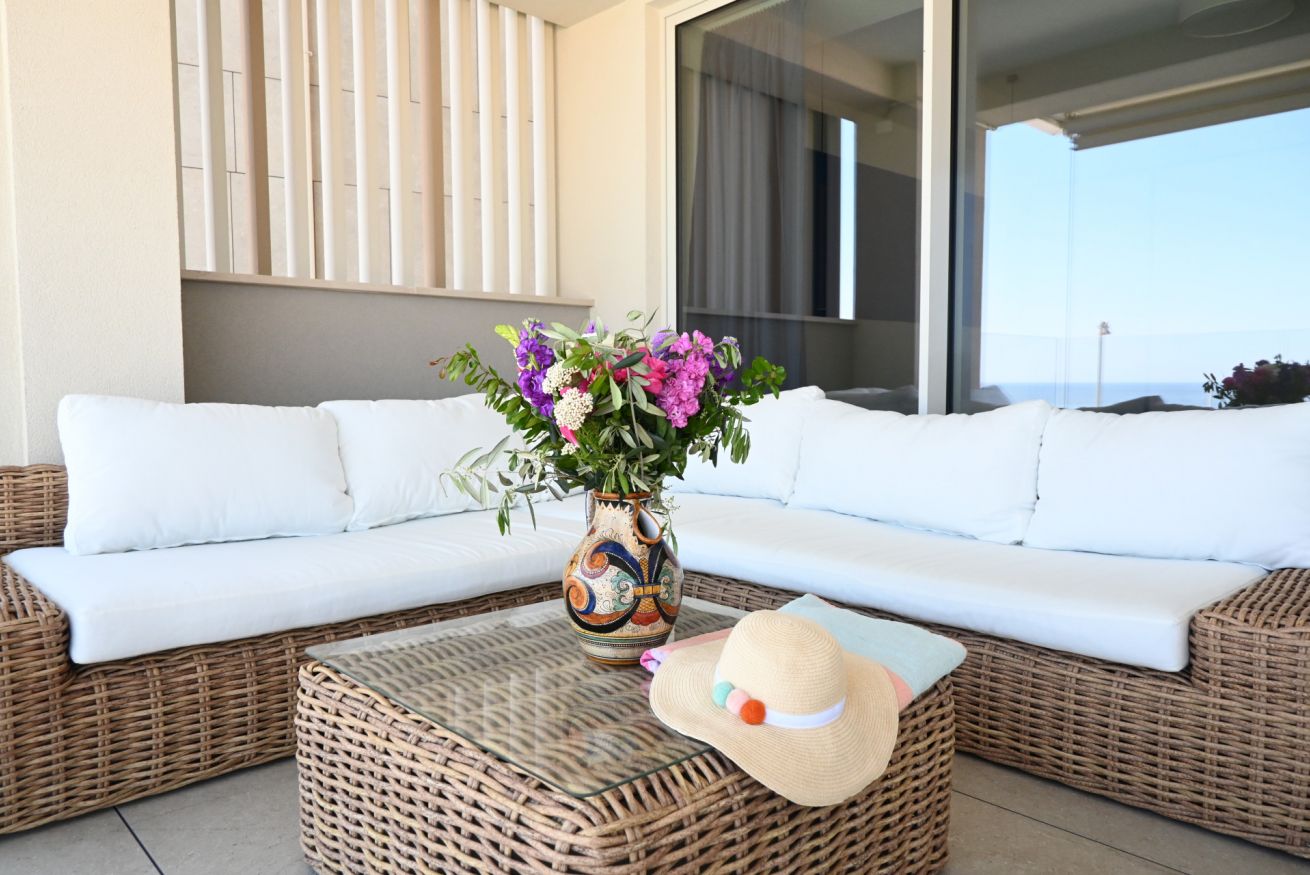 Ingresso su soggiorno con divano letto matrimoniale e tavolo da pranzo - cucina super accessoriata con lavastoviglie - camera con letto matrimoniale - seconda camera con letto a castello - bagno completo con box doccia - terrazzo attrezzato con tavolo e sedie dotato di incantevole vista mare.