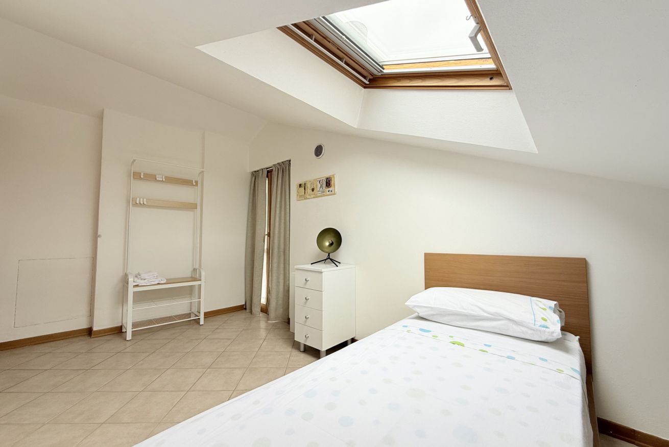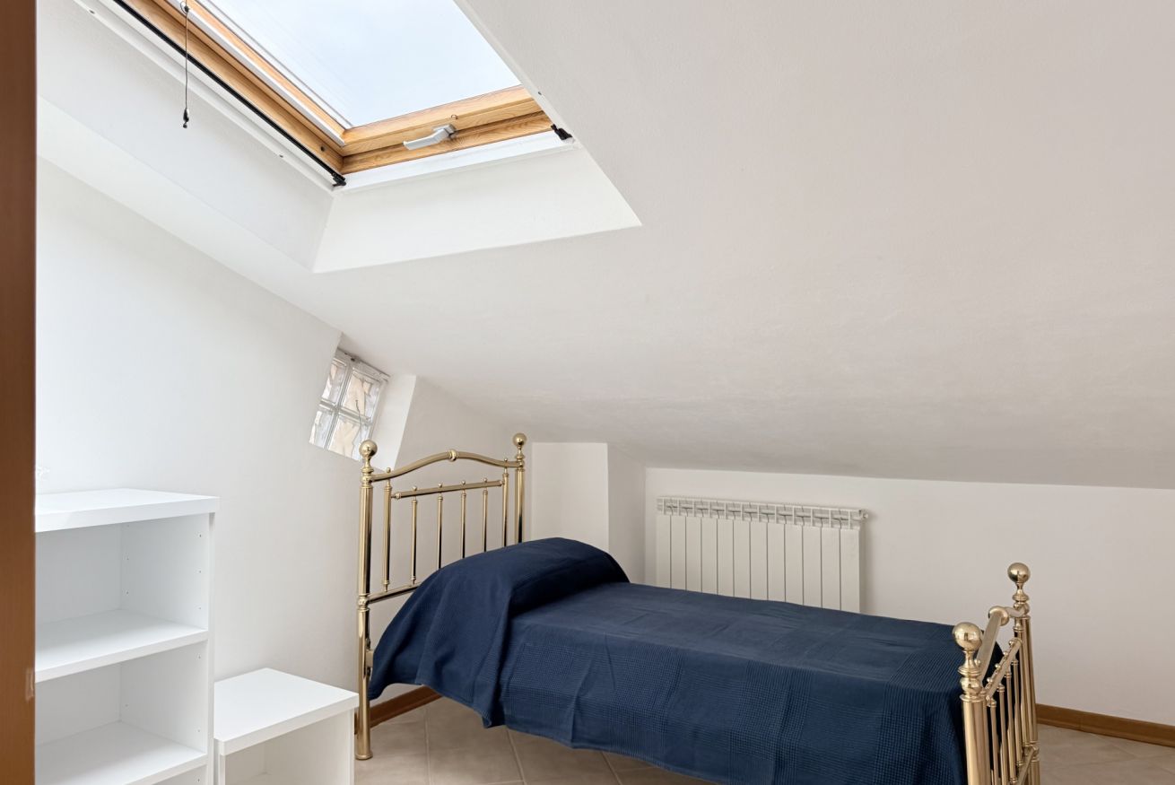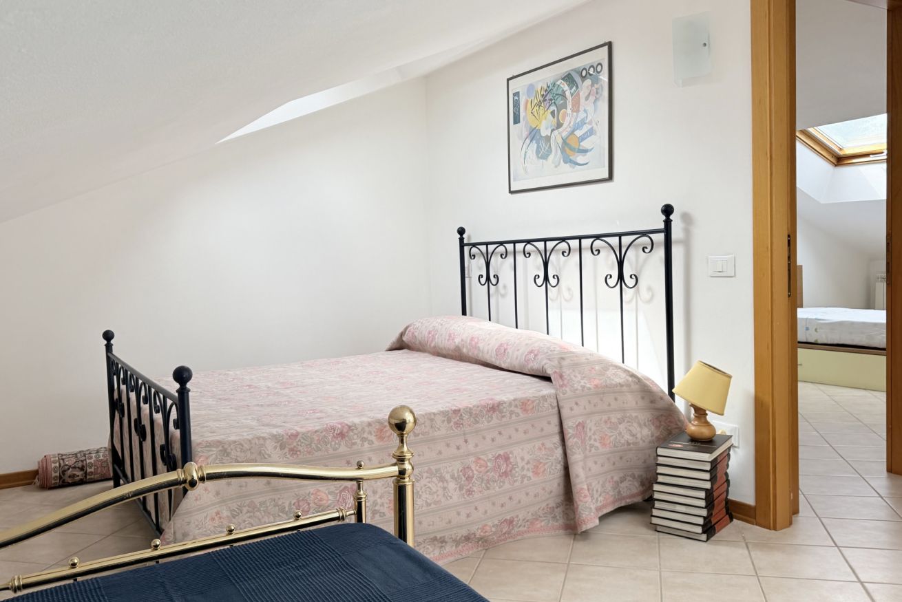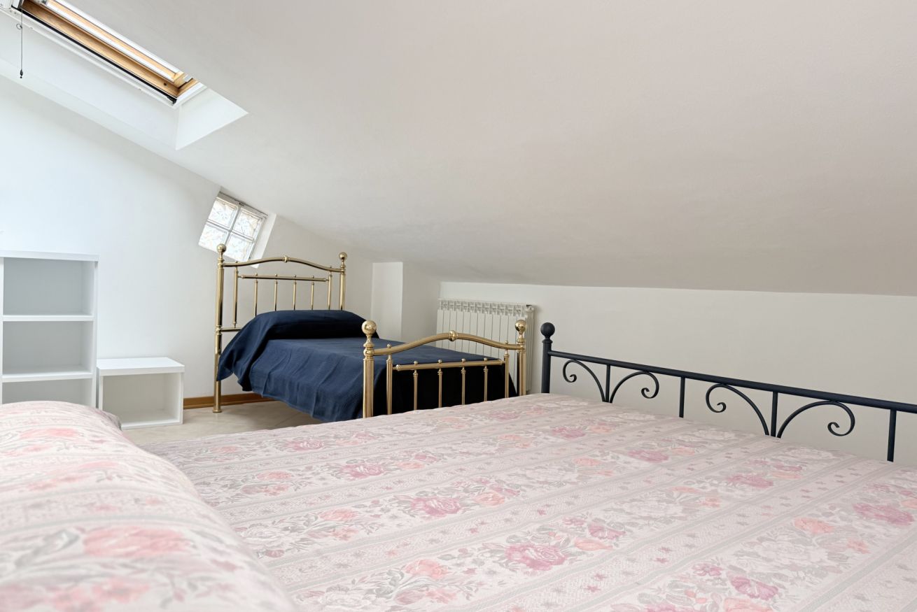 Descrizione: ampio quadrilocale su due livelli. Ingresso al piano terra su soggiorno con angolo cottura dotato di lavastoviglie – camera matrimoniale – bagno completo con box doccia e lavatrice. Al piano superiore si accede ad una camera con letto matrimoniale e letto singolo – seconda camera con letto singolo – bagno con doccia. Ampio giardino.