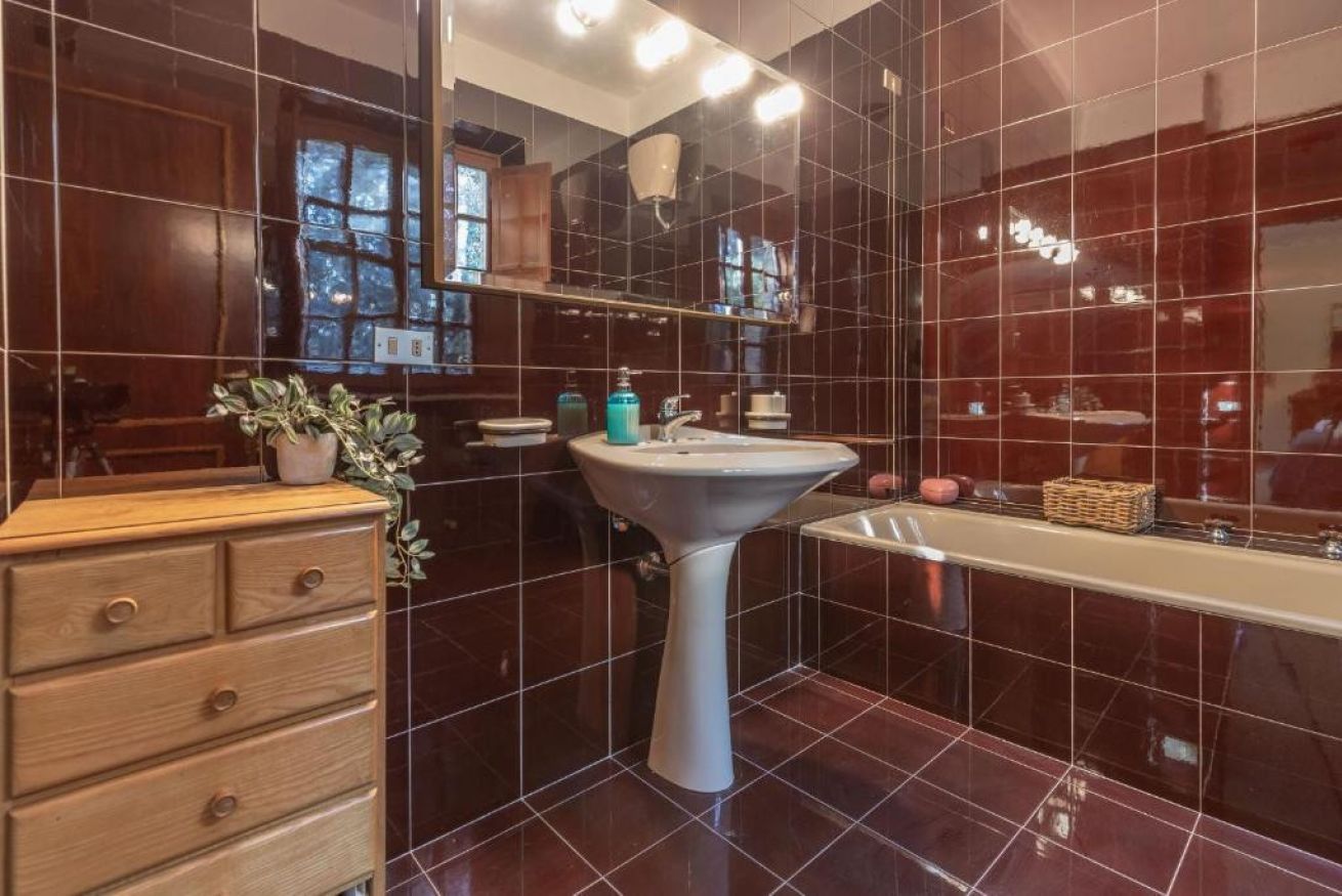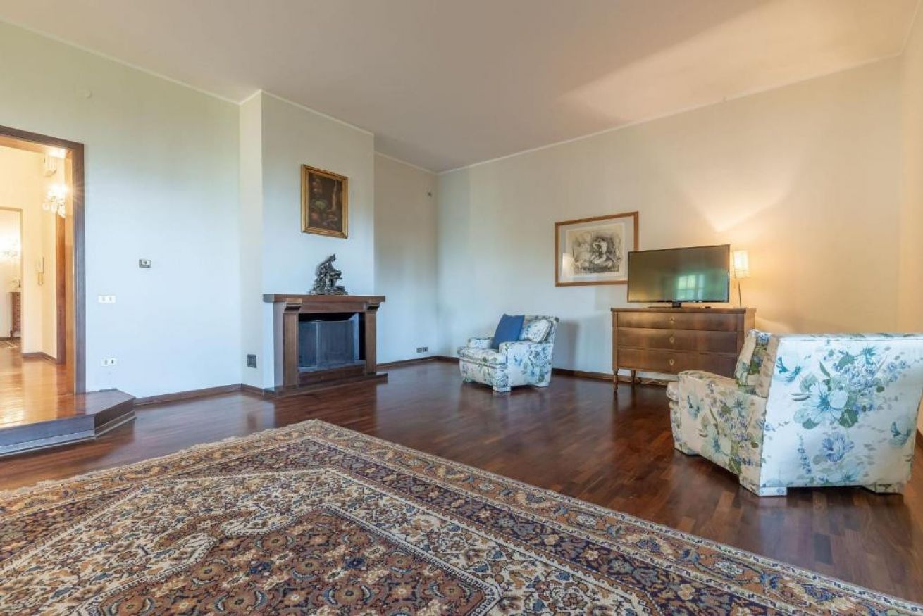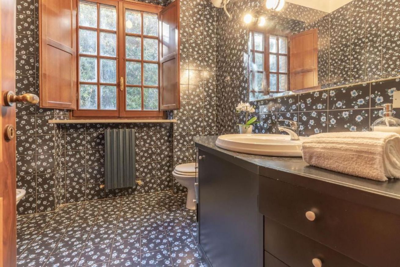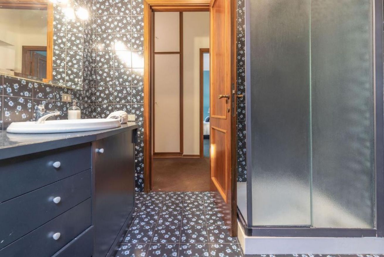 Piano terra: ingresso su disimpegno, bagno di servizio (senza doccia) e studiolo. Ampia e luminosa zona giorno composta da soggiorno con divani e TV, sala da pranzo e cucina completamente attrezzata (con lavastoviglie).